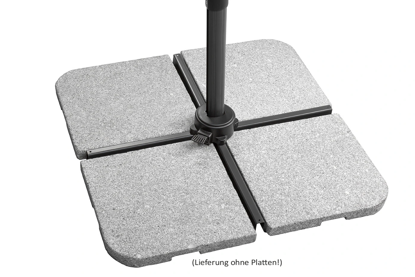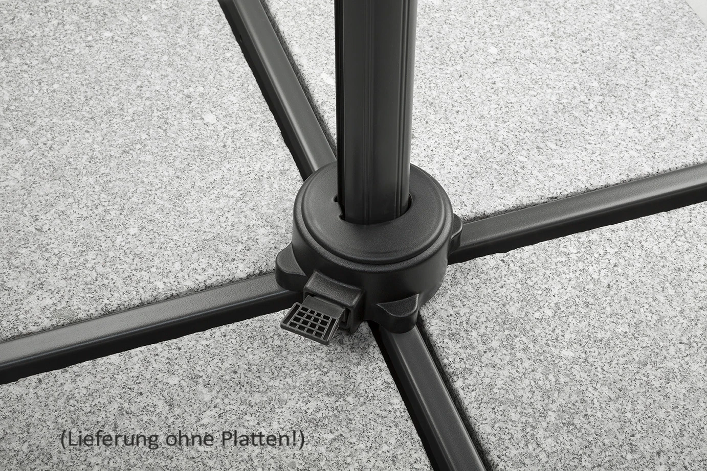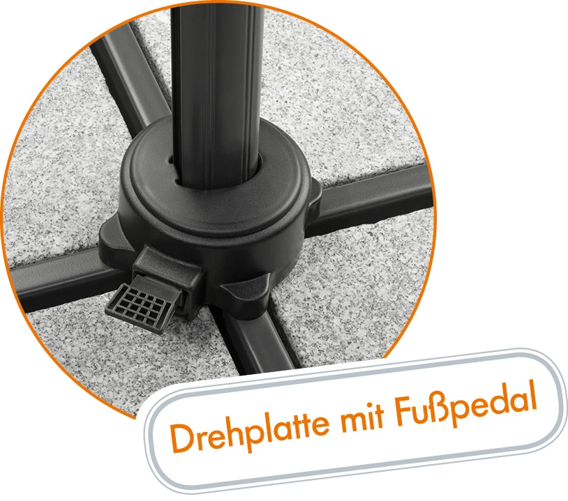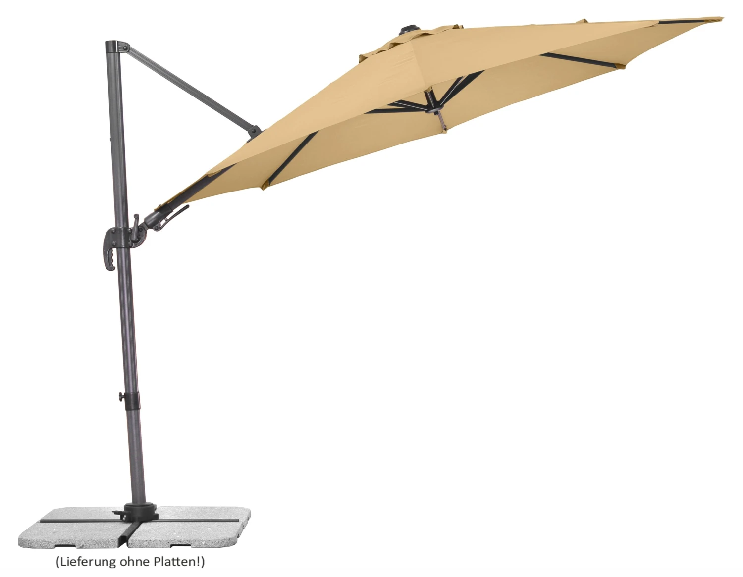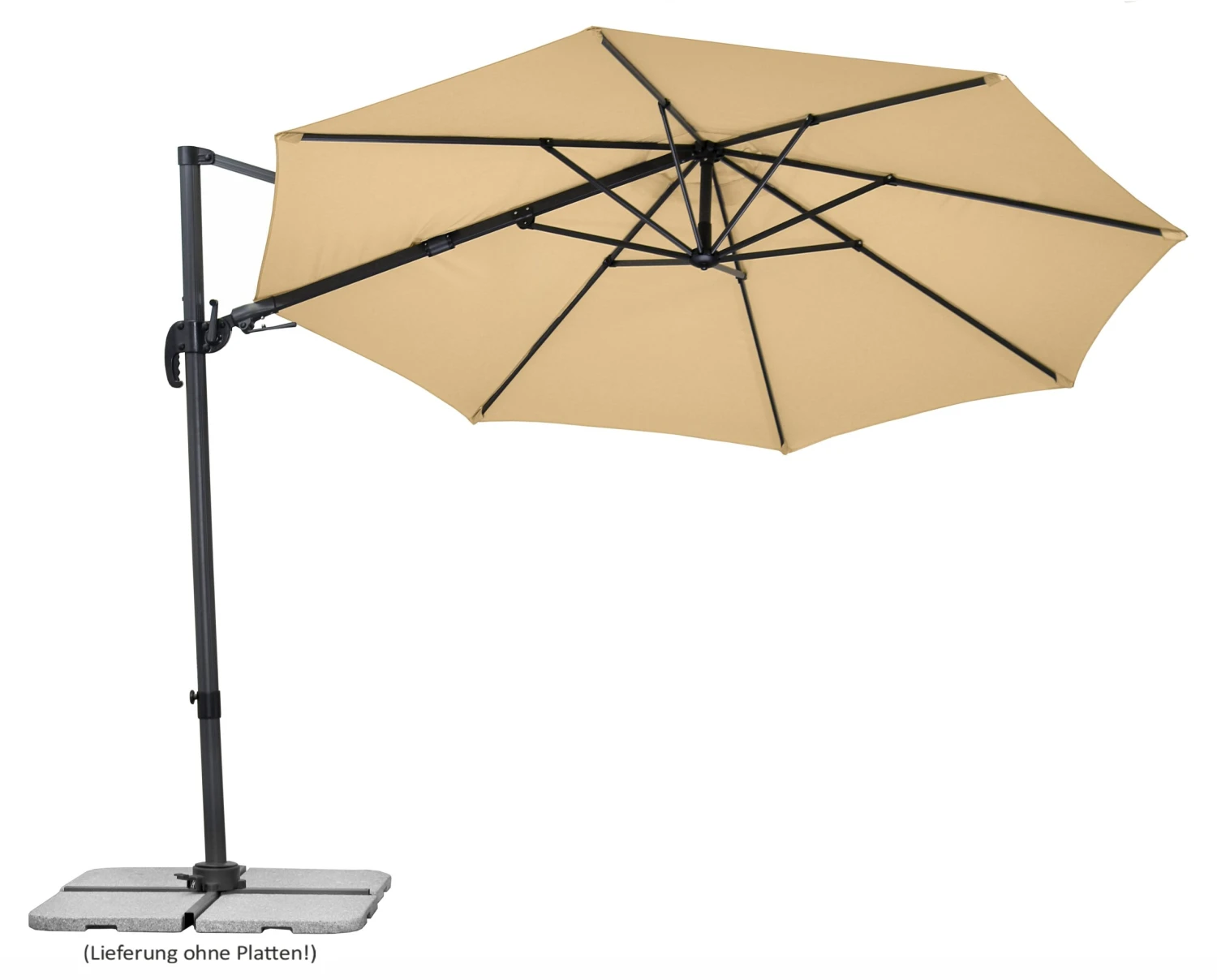 Ca. 300 cm Ø Bespannung aus 100 % Polyester, ca. 180 g/m², verrottungsfest, hoch lichtecht, wasserabstoßend imprägniert, ohne Volant, mit air-vent, abnehmbar für Handwäsche, runder Schirm mit ca. 300 cm Ø. Gestell aus anthrazitgrau pulverbeschichtetem Alu/Stahl, 2-teiliger Mast aus Aluminium ca. 50 x 67 mm, Stahlstreben ca. 13 x 22 mm, neigbar, per Drehteller mit Fußpedal um 360° drehbar, entlang des Arms seitlich kippbar. Plattenständer für Wegeplatten 50 x 50 x 5 cm (Lieferung ohne Wegeplatten). Erhältlich in den Farben: natur, taupe und anthrazit. -Nur für den privaten Gebrauch im Außenbereich-