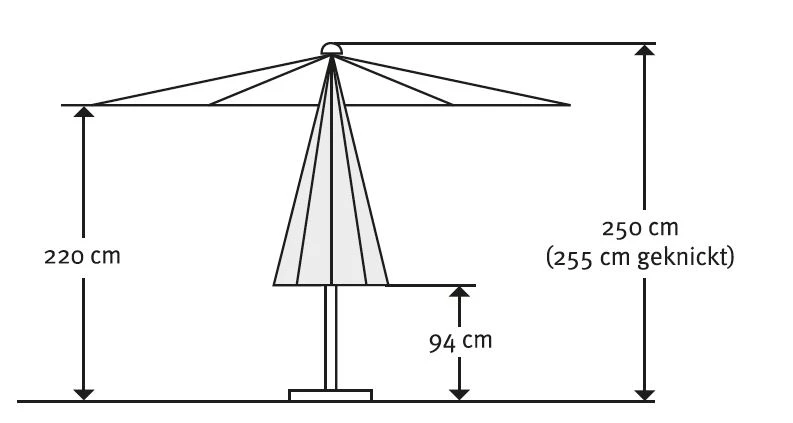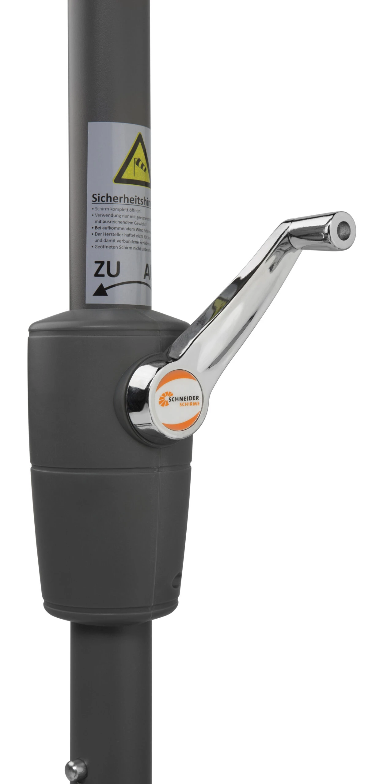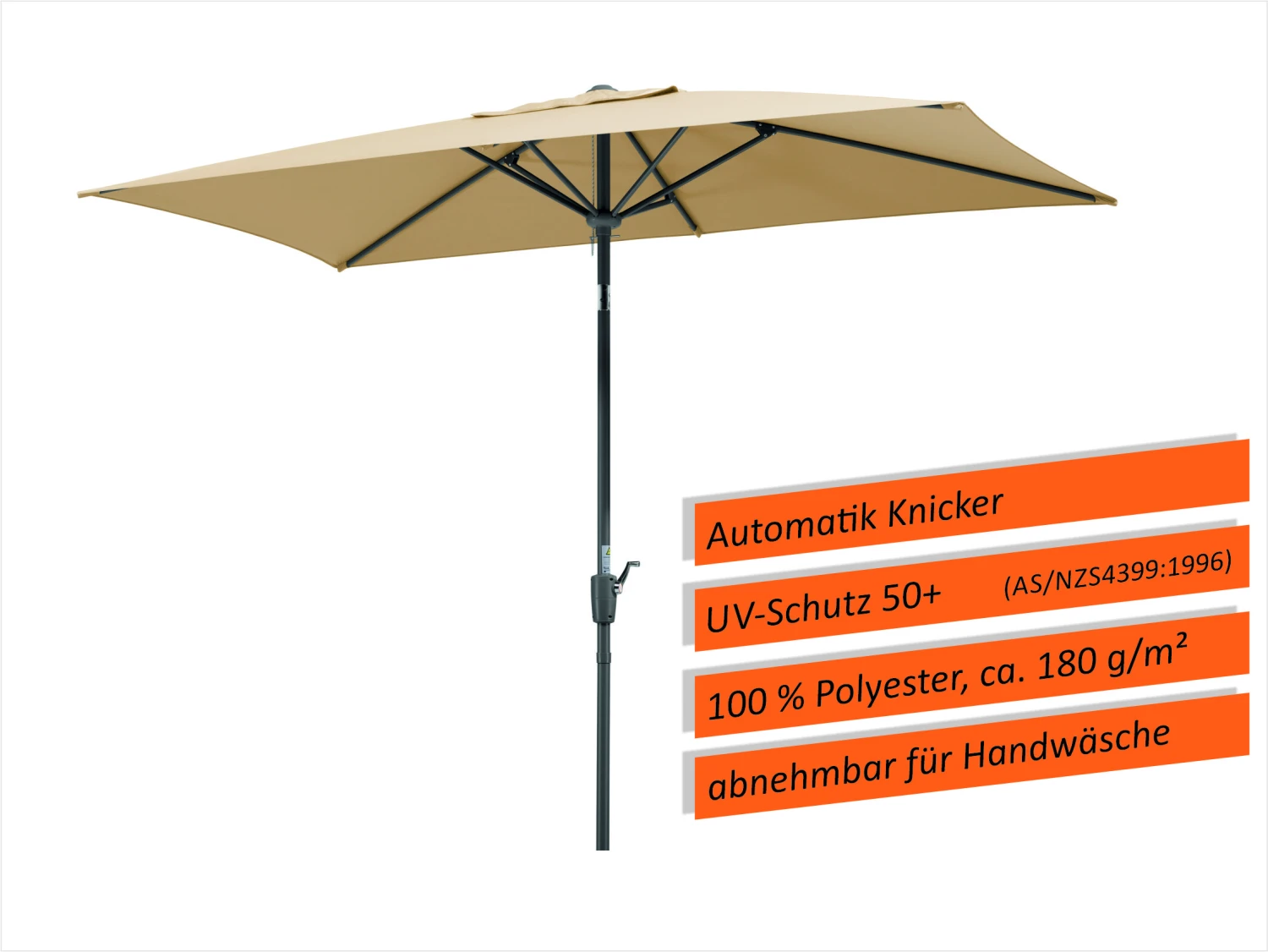 Unser Sonnenschirm Modell Tunis ist ein hochwertiger Rechteckschirm mit topmodischer Farbauswahl. Mit seiner Form eignet er sich besonders für den Einsatz auf dem Balkon. Aber auch in Ihrem Garten oder auf Ihrer Terrasse macht er eine gute Figur und spendet Ihnen angenehmen Schatten. Tunis – der Trick mit dem Knick Der Schirm Tunis ist ein rechteckiger Sonnenschirm mit einer Größe von ca. 270 x 150 cm. Die Bespannung besteht aus 100 % Polyester und ist verrottungsfest. Die Stoffstärke liegt bei ca. 180 g/m², was sie sehr widerstandsfähig macht. Der Bezug ist ohne Volant gefertigt, wodurch die elegante Note betont wird. Außerdem ist die Bespannung wasserabstoßend imprägniert, wodurch Sie auch einem leichten Regenschauer standhält und im Nu wieder getrocknet ist. Mit einem UV-Schutz von 50+ wird Ihnen mit diesem Produkt ein ausgezeichneter Sonnenschutz geboten. Dieser Wert wurde nach ausführlichen Testreihen gemäß der australisch-neuseeländischen Norm festgelegt. Besondere Merkmale Das Gestell hat eine anthrazitgraue Pulverbeschichtung. Der Stock hat einen stabilen Durchmesser von ca. 38 mm und ist zweiteilig, wodurch Sie den Schirm problemlos auseinanderbauen und über den Winter platzsparend einlagern können. Mithilfe der integrierten Kurbel lässt sich der Schirm ohne großen Kraftaufwand Öffnen und Schließen. Durch einfaches Weiterdrehen der Kurbel knickt der Schirm und bietet damit optimalen Schatten. Die Gesamthöhe des aufgestellten Schirmes beträgt ca. 250 cm, mit einer Durchgangshöhe von ca. 220 cm. Im geknickten Zustand beträgt die Gesamthöhe ca. 255 cm. Zubehör Um einen sicheren und stabilen Stand zu gewährleisten, empfehlen wir einen Schneider Schirmständer mit einem Mindestgewicht von ca. 40 kg zu verwenden. Passende Schirmständer, die mit diesem Schirm verwendet werden können sind: PE-Ständer ca. 45 ltr. zum Befüllen mit Sand oder Wasser (Art. 856-01 weiß oder 856-15 anthrazit) und der PE-Ständer ca. 40 kg anthrazit (Art. 857-15). Alternativ können Sie auch folgende Produkte verwenden: Rasen-Vierzack (Art. 863-00), Bodenhülse (Art. 827-00), Bodendübel (Art. 888-00), Plattenständer für Wegeplatten in der Größe 40 x 40 cm oder 50 x 50 cm (Art. 837-15, Lieferung erfolgt ohne Platten) oder Betonständer ca. 40 kg anthrazit (Art. 898-15). Außerdem empfehlen wir die Verwendung einer Schutzhülle während Sie den Schirm nicht nutzen, da Sie hiermit die Lebensdauer Ihres Schirmes erhöhen und länger Freude an dem erworbenen Produkt haben werden. Die lichtundurchlässige Schutzhülle ist ebenfalls separat erhältlich (Art. 821-00).