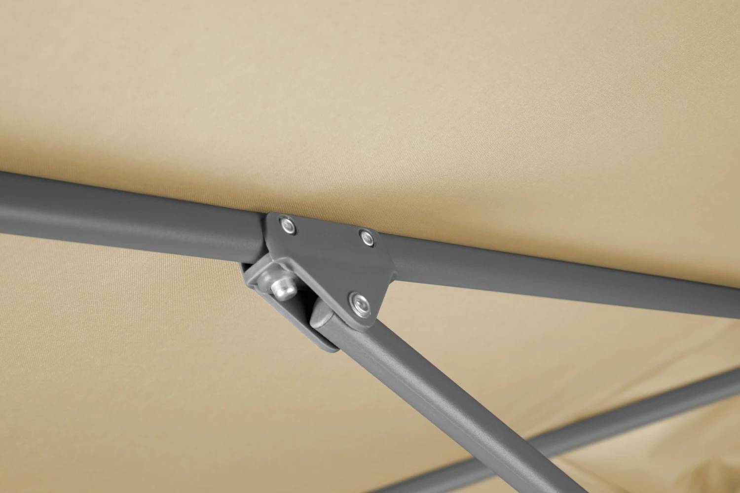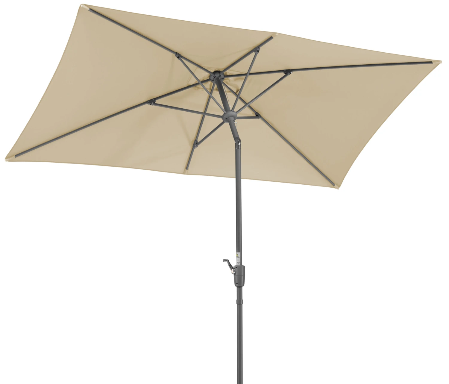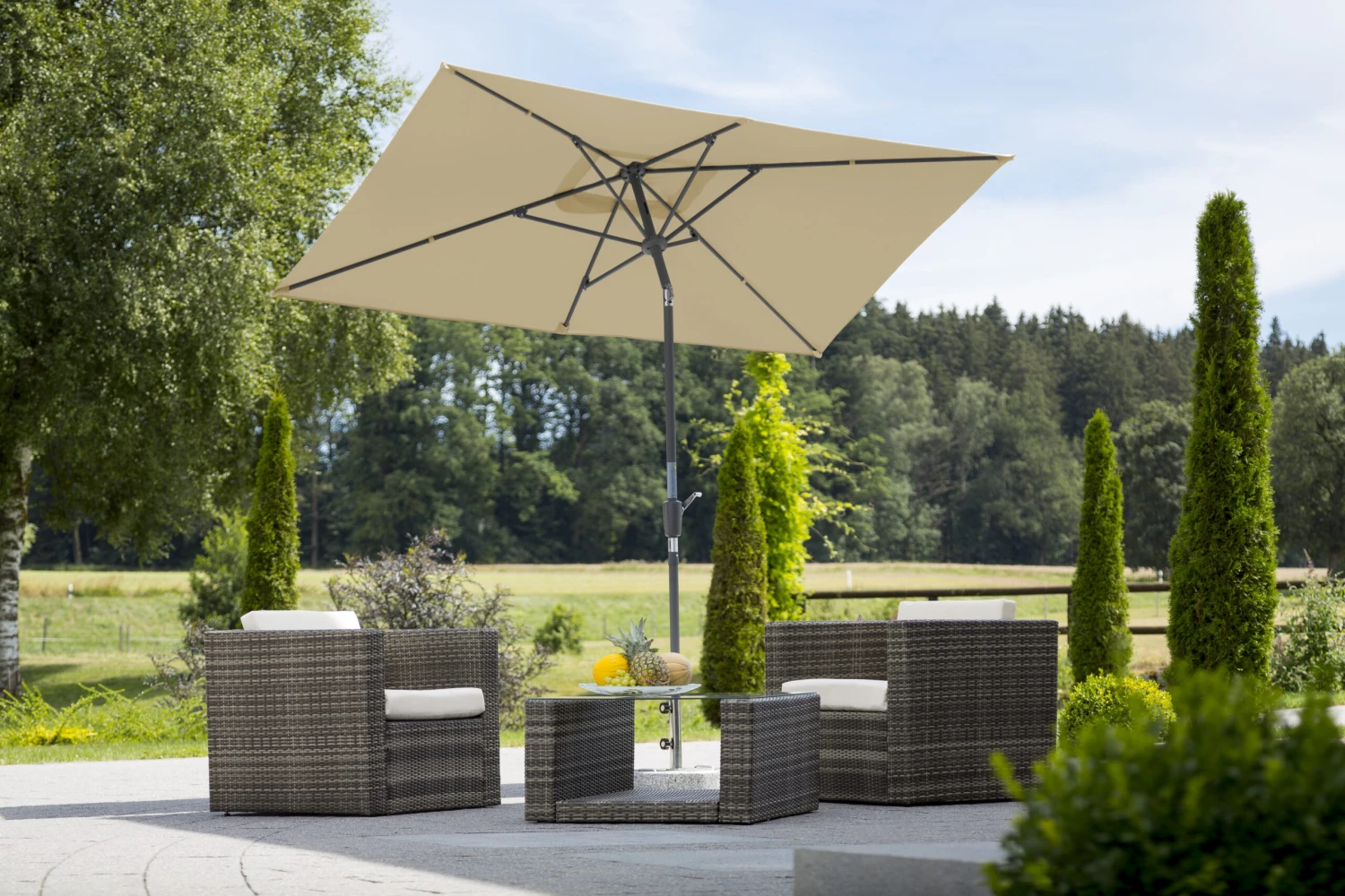 Unser Sonnenschirm Modell Tunis ist ein hochwertiger Rechteckschirm mit topmodischer Farbauswahl. Mit seiner Form eignet er sich besonders für den Einsatz auf dem Balkon. Aber auch in Ihrem Garten oder auf Ihrer Terrasse macht er eine gute Figur und spendet Ihnen angenehmen Schatten. Tunis – der Trick mit dem Knick Der Schirm Tunis ist ein rechteckiger Sonnenschirm mit einer Größe von ca. 270 x 150 cm. Die Bespannung besteht aus 100 % Polyester und ist verrottungsfest. Die Stoffstärke liegt bei ca. 180 g/m², was sie sehr widerstandsfähig macht. Der Bezug ist ohne Volant gefertigt, wodurch die elegante Note betont wird. Außerdem ist die Bespannung wasserabstoßend imprägniert, wodurch Sie auch einem leichten Regenschauer standhält und im Nu wieder getrocknet ist. Mit einem UV-Schutz von 50+ wird Ihnen mit diesem Produkt ein ausgezeichneter Sonnenschutz geboten. Dieser Wert wurde nach ausführlichen Testreihen gemäß der australisch-neuseeländischen Norm festgelegt. Besondere Merkmale Das Gestell hat eine anthrazitgraue Pulverbeschichtung. Der Stock hat einen stabilen Durchmesser von ca. 38 mm und ist zweiteilig, wodurch Sie den Schirm problemlos auseinanderbauen und über den Winter platzsparend einlagern können. Mithilfe der integrierten Kurbel lässt sich der Schirm ohne großen Kraftaufwand Öffnen und Schließen. Durch einfaches Weiterdrehen der Kurbel knickt der Schirm und bietet damit optimalen Schatten. Die Gesamthöhe des aufgestellten Schirmes beträgt ca. 250 cm, mit einer Durchgangshöhe von ca. 220 cm. Im geknickten Zustand beträgt die Gesamthöhe ca. 255 cm. Zubehör Um einen sicheren und stabilen Stand zu gewährleisten, empfehlen wir einen Schneider Schirmständer mit einem Mindestgewicht von ca. 40 kg zu verwenden. Passende Schirmständer, die mit diesem Schirm verwendet werden können sind: PE-Ständer ca. 45 ltr. zum Befüllen mit Sand oder Wasser (Art. 856-01 weiß oder 856-15 anthrazit) und der PE-Ständer ca. 40 kg anthrazit (Art. 857-15). Alternativ können Sie auch folgende Produkte verwenden: Rasen-Vierzack (Art. 863-00), Bodenhülse (Art. 827-00), Bodendübel (Art. 888-00), Plattenständer für Wegeplatten in der Größe 40 x 40 cm oder 50 x 50 cm (Art. 837-15, Lieferung erfolgt ohne Platten) oder Betonständer ca. 40 kg anthrazit (Art. 898-15). Außerdem empfehlen wir die Verwendung einer Schutzhülle während Sie den Schirm nicht nutzen, da Sie hiermit die Lebensdauer Ihres Schirmes erhöhen und länger Freude an dem erworbenen Produkt haben werden. Die lichtundurchlässige Schutzhülle ist ebenfalls separat erhältlich (Art. 821-00).