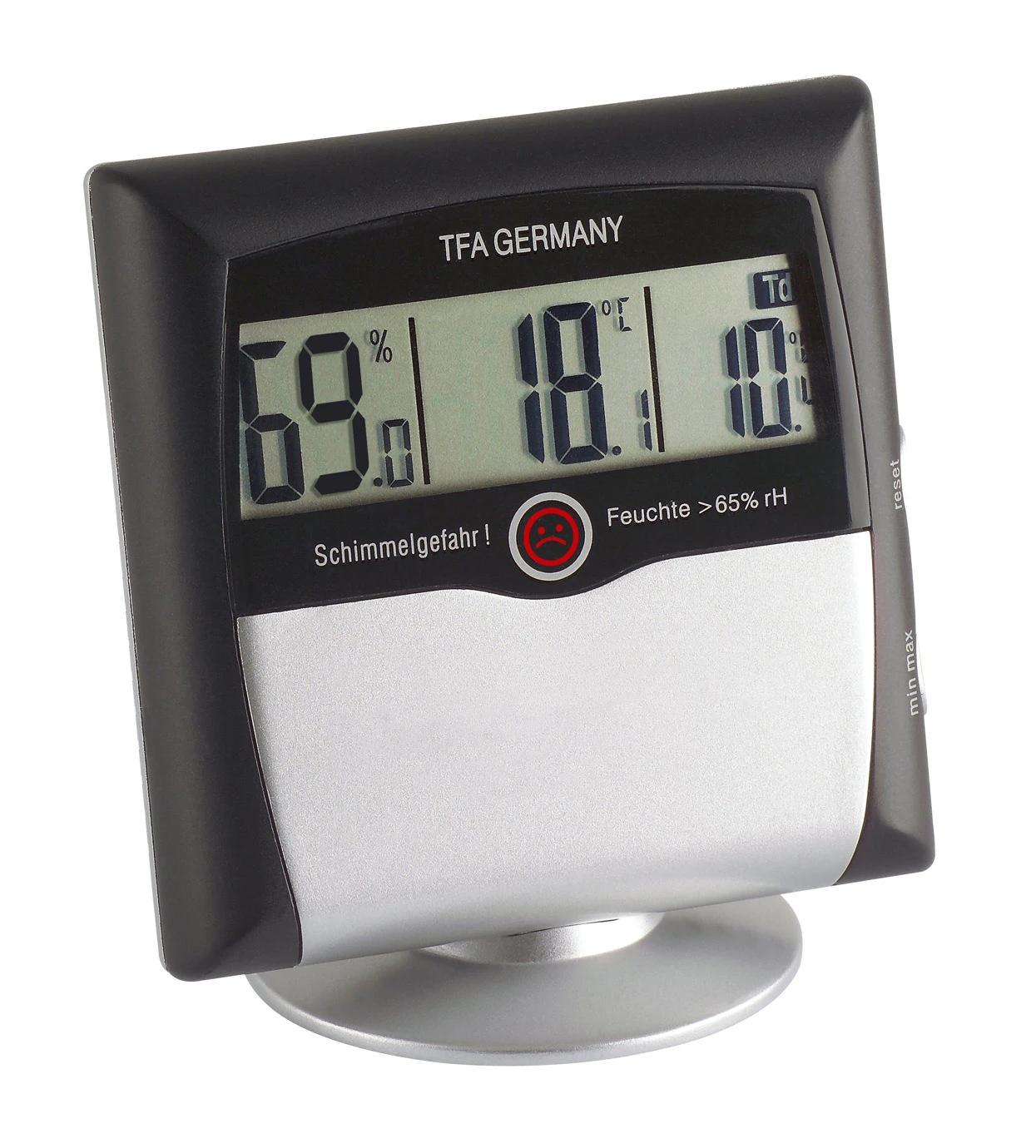 Duschen, kochen, Wäsche trocknen: Durch seine Aktivitäten setzt der Mensch kontinuierlich Wasserdampf frei. Findet nicht genügend Luftaustausch statt, kann die Raumluft schnell zu feucht werden und es besteht die Gefahr von Schimmelbildung. Keine Chance hat dieser lästige Mitbewohner, wenn der COMFORT CONTROL im Einsatz ist. Denn erst eine dauerhaft hohe Luftfeuchtigkeit von über 65 % kann den gefürchteten Schimmelpilz an Wänden und in Schränken hervorrufen. Das Thermo-Hygrometer zeigt die gemessenen Temperatur- und Luftfeuchtigkeitswerte an. Zusätzlich warnt ein optisches und akustisches Signal bei drohender Schimmelgefahr. So können Sie rechtzeitig reagieren und sich durch gezieltes Heizen und Lüften ein behagliches und gesundes Wohnklima schaffen. Als weiteren Indikator zeigt das Instrument den Taupunkt an, also die Temperatur, ab der die Feuchtigkeit in der Luft zu kondensieren beginnt und sich an entsprechend kalten Stellen Wassertröpfchen bilden die Vorstufe von Schimmel. In Ihrem COMFORT CONTROL arbeiten sehr präzise und besonders reaktionsschnelle Sensoren zur Ermittlung von Temperatur und Luftfeuchtigkeit. Somit kann das Gerät möglichst genaue Messwerte anzeigen.
