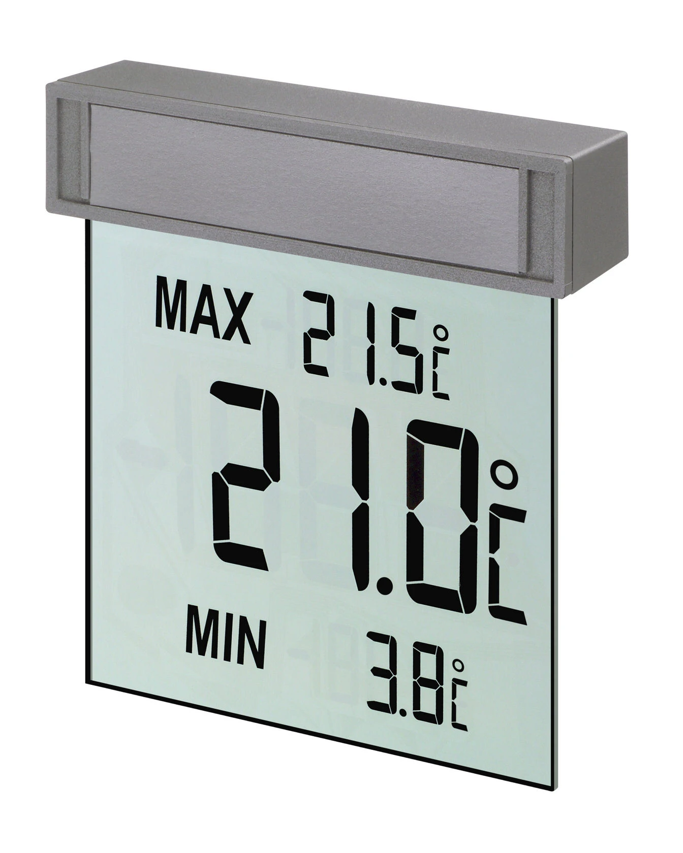 Einfacher geht es nun wirklich nicht mehr, sich über das Wetter draußen zu informieren. Ist das VISION von TFA im Einsatz, steht die Außentemperatur in großen digitalen Ziffern praktisch direkt auf der Fensterscheibe. Flach, leicht und elegant hängt das Thermometer außen am Fenster, die Temperatur lässt sich bequem von innen ablesen. Die Höchst- und Tiefstwerte des Tages stehen gleich mit dabei, immer aktuell durch die tägliche automatische Rückstellung. Das wetterfeste Thermometer ist ganz leicht zu befestigen: Den Halter von außen auf die Scheibe kleben, das Gerät einhängen, fertig. Und zum Fensterputzen oder Batterieaustauschen ist es entsprechend einfach wieder abnehmbar.