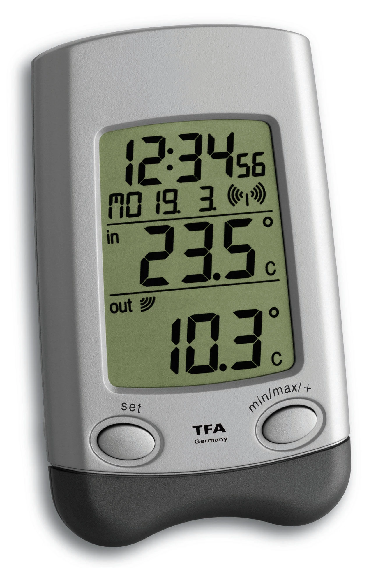 Immer auf dem aktuellen Stand in Sachen Temperatur – mit dem WAVE Funk-Thermometer von TFA.?Die Außentemperatur vor Ort wird über einen eigenen Funksender ermittelt, die Raumtemperatur misst ein interner Sensor? Die Kontrolle der Raumtemperatur ist ein wichtiger Faktor für ein behagliches und gesundes Wohnklima und hilft beim Energiesparen. Schon ein Grad Temperaturabsenkung bringt bis zu 6 % weniger Heizkosten.?Mit der Außentemperatur erhalten Sie zuverlässig eine wichtige Information für Haus, Garten, Freizeit und Beruf?Zusätzlich verfügt das Gerät über einen Speicher für die Höchst- und Tiefstwerte. Die aktuelle Uhrzeit und das Datum werden über das DCF 77 Funkuhr-Signal automatisch empfangen und täglich aktualisiert.