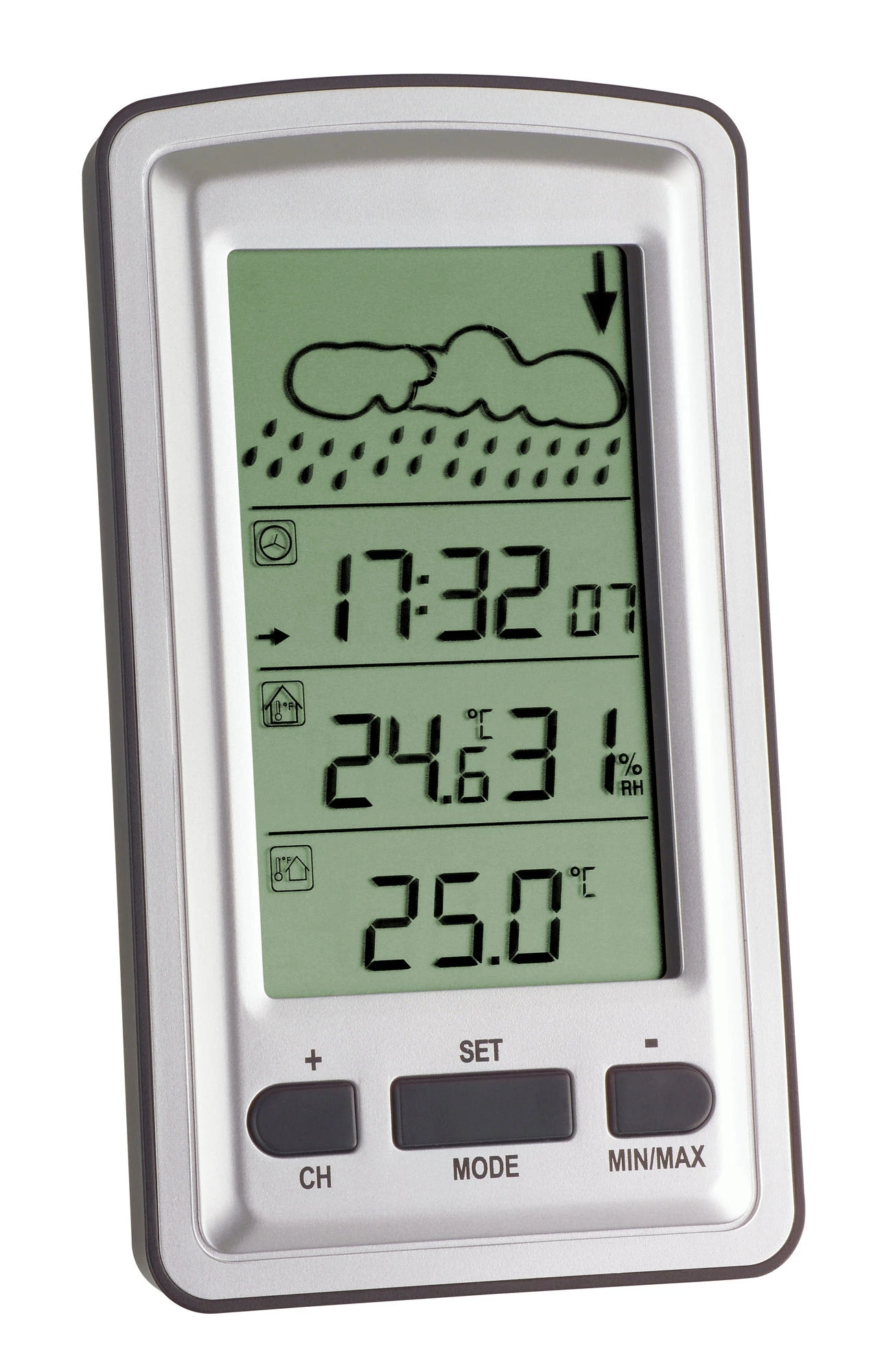 Wie entwickelt sich das lokale Wetter heute? Mit einem Blick auf das Display der AXIS Funk-Wetterstation sind Sie immer informiert. Die Außentemperatur vor Ort wird von einem Funksender direkt ermittelt. Sonne, Wolken oder Regentropfen – ein integriertes elektronisches Barometer misst den Luftdruck; auf Basis der Veränderungen gibt das Wettersymbol eine Prognose für das kommende Wetter. Zur Kontrolle des Raumklimas werden Temperatur und Luftfeuchtigkeit angezeigt. Durch gezieltes Heizen und Lüften schaffen Sie sich ein angenehmes und gesundes Wohnklima und sparen sogar Heizkosten. Die aktuelle Uhrzeit und das Datum werden über das DCF 77 Funksignal empfangen. Ein Weckalarm holt Sie immer zur richtigen Zeit aus dem Schlummer. Und mit der Hintergrundbeleuchtung lässt sich das übersichtliche Display auch im Dunklen gut ablesen. Zwei weitere Sender zur Temperaturkontrolle, z.B. im Kinderzimmer, Schlafzimmer, Keller oder Garage, sind anschließbar.