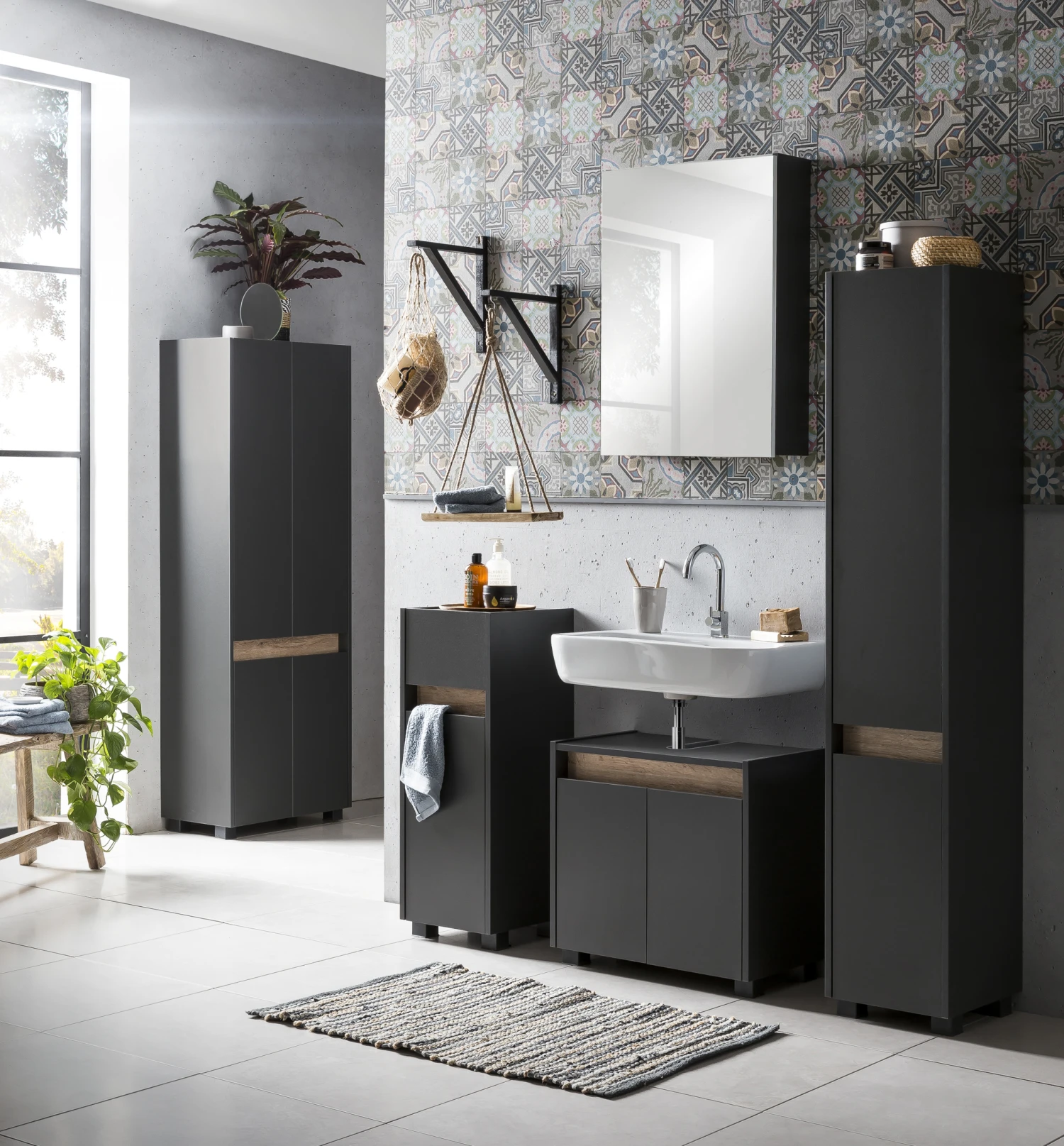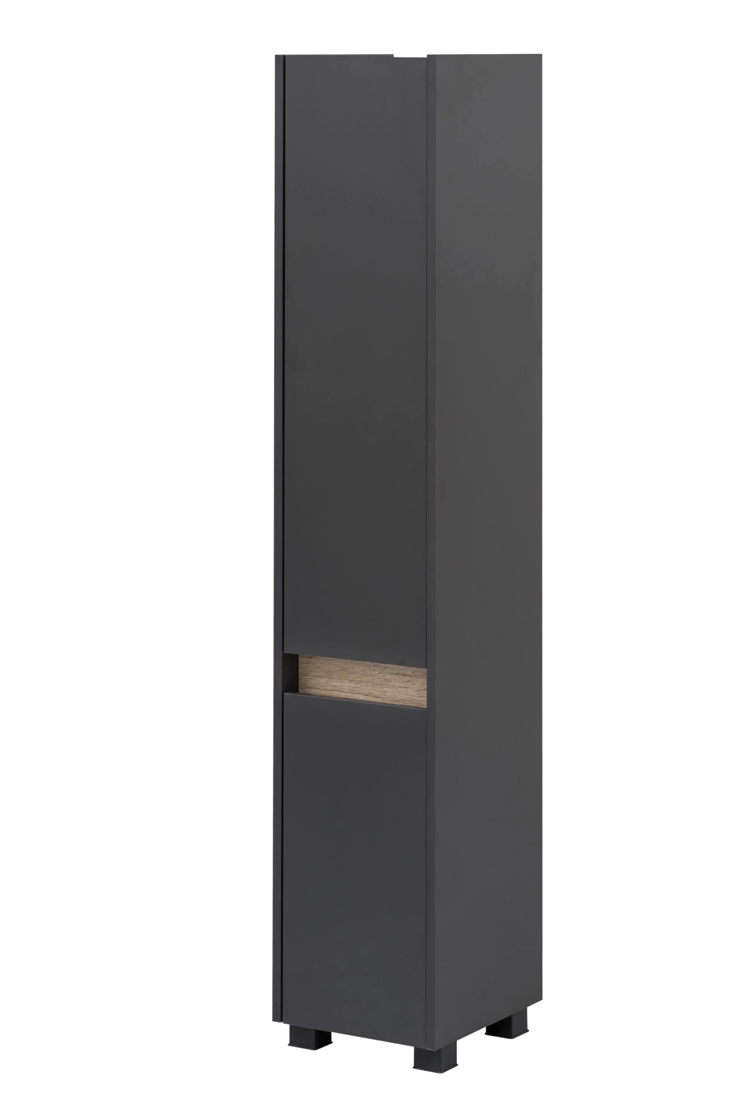 Hochschrank mit 2 Türen, 1 Einlegeboden hinter der unteren Tür, 2 Einlegeböden hinter der oberen Tür, Türanschlag frei wählbar, Grifflose Türöffnung – Eingriff Tür von oben, Traverse in wildeiche Dekor, Sockelfüße aus Kunststoff, Beschläge aus Metall, Fachmaß hinter der Tür unten: (B/T/H) ca. 27x29x60 cm, Fachmaß hinter der Tür oben: (B/T/H) ca. 27x29x93 cm, Nur stehende Montage