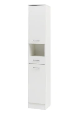 Hochschrank mit 2 Türen, 3 Einlegeböden, 1 Schubkasten und 1 offenes Fach, Schubkasteninnenmaß: (BxTxH) ca. 23,7x26x10 cm, Maß offenes Fach: (BxTxH) ca. 27x28x20,8 cm, Türanschlag wechselbar,Sockelhöhe ca. 11 cm