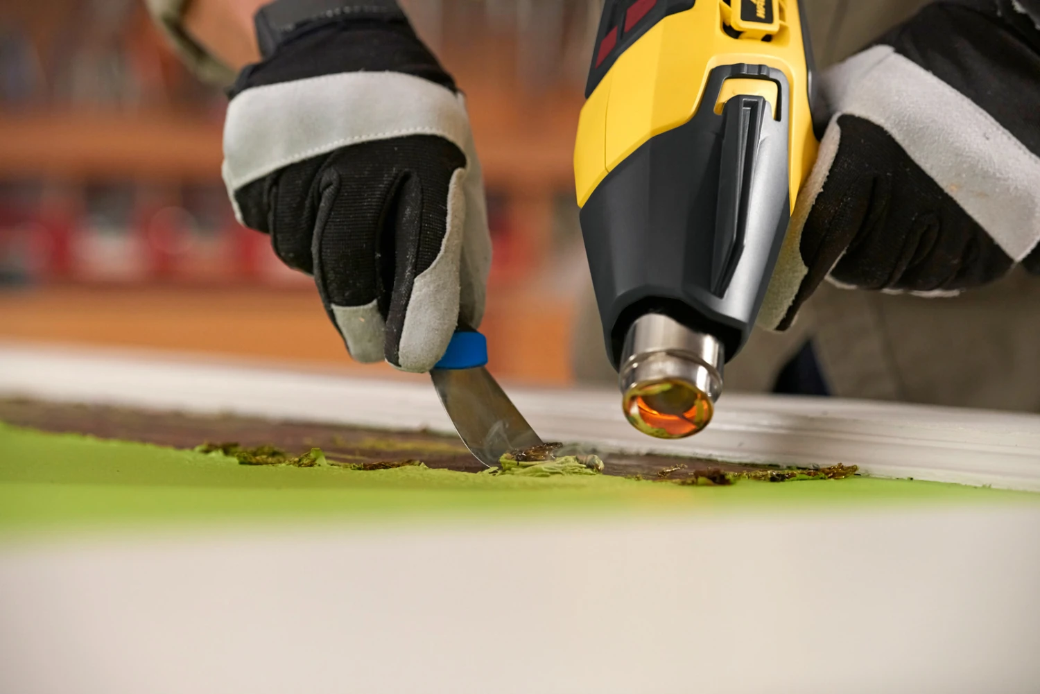 Auch auf Sicherheit wird höchsten Wert gelegt, die Pistole besitzt einen thermischen Schutz-Sensor für die Regulierung der Hitze. Ein Hitzeschild mit seitlichen Abstandshaltern verhindert den Oberflächenkontakt der heißen Düse mit dem Werkstück. Das Hitzeschild kann an schwer erreichbaren, engen Stellen jedoch entfernt werden. Dank der stabilen Standfläche auf der Rückseite ist auch beidhändiges Arbeiten möglich. Im Lieferumfang enthalten ist eine Abstrahldüse für empfindliche Oberflächen (z.B. Glas) und eine Zentrierdüse zum Ablösen von Farbe. Nach der Fertigstellung des Projektes kann die FURNO 500 ganz einfach an der Aufhängevorrichtung bis zum nächsten Einsatz aufbewahrt werden.